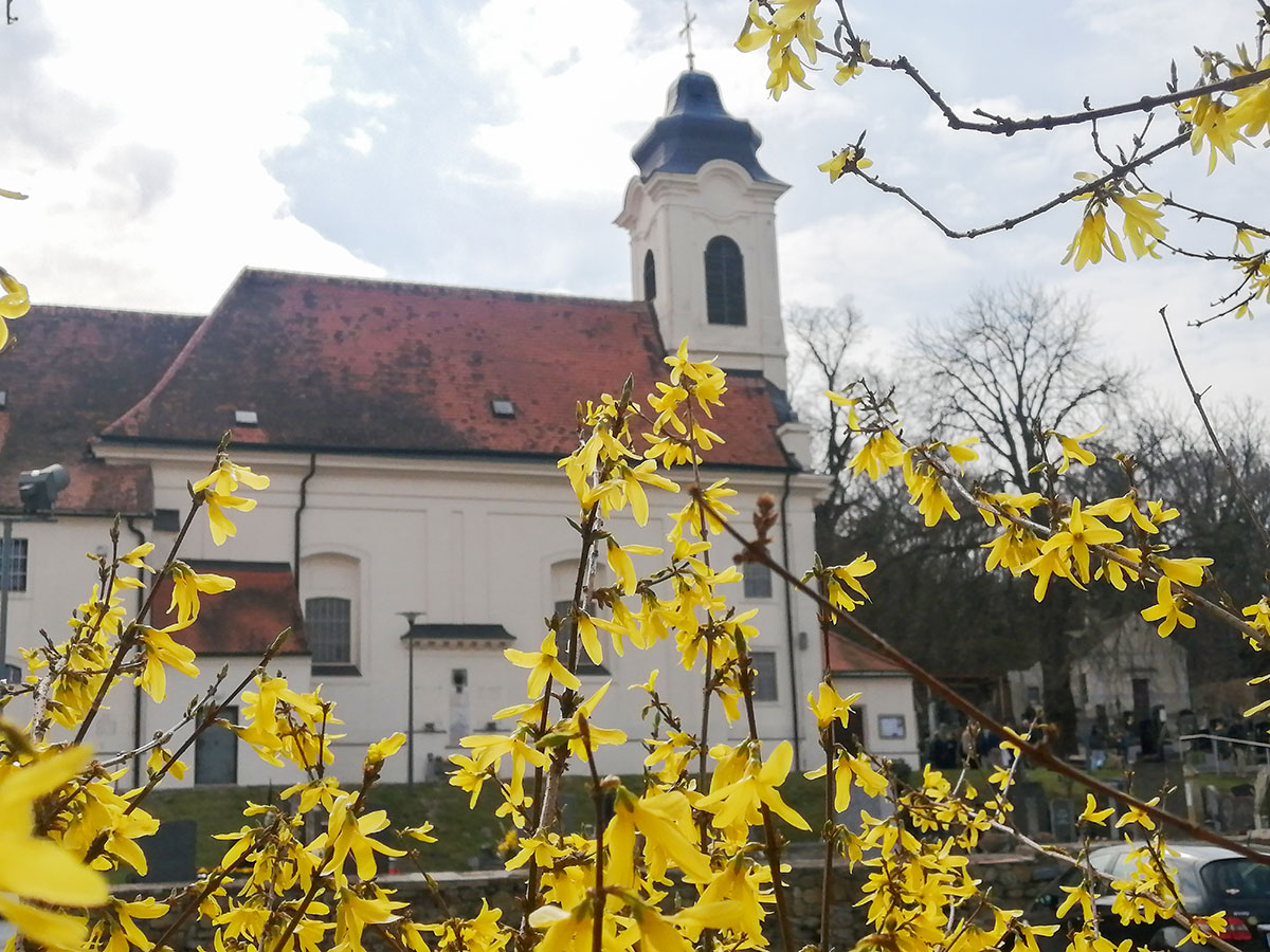 Dann geht’s hinauf auf den Veitsberg und wieder hinunter nach Bisamberg. Vorbei an der Kleinengersdorfer Kirche „St. Veit“ wandern wir den „My Way“ (mit Kunstobjekten) zurück nach Hagenbrunn. Dort kehren wir bei einem Heurigen zum Mittagessen ein.